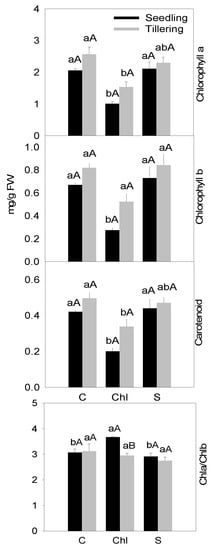 Effects of salinity stress application on chlorophyll and carotenoids content of IKP rice cultivar grown in the Yoshida nutrient solution without salt stress (C), with 40 mM NaCl (Chl) or 20 mM Na2SO4 (S). Each value is the mean of three replicates per treatment and vertical bar is standard error of mean. Treatments followed by the same lower-case letter for a particular vegetative stage do not differ statistically. Vegetative stage, followed by the same upper-case letter in a particular treatment, do not differ statistically.