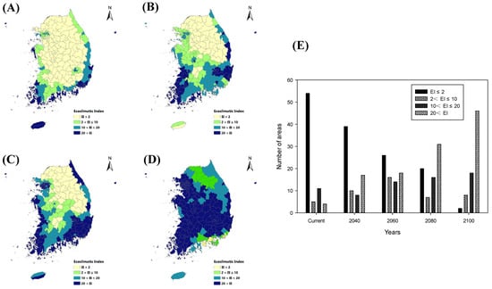 Predicted distribution of red imported fire ant ((A): 2040, (B): 2060, (C): 2800, (D): 2100), and changes in EI values by the number of areas and times in response to climate change (E).