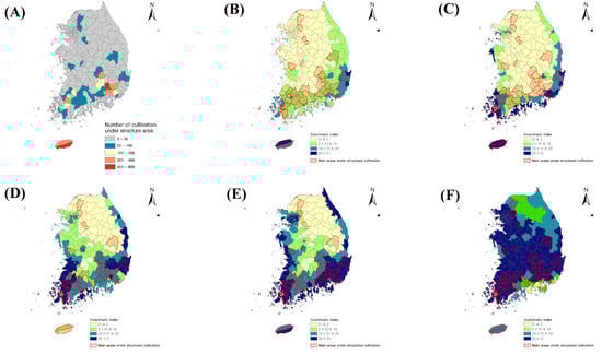 Red imported fire ant is distributed in agricultural fields and croplands in the United States and Puerto Rico, suggesting the possibilities of invasion into agricultural facilities and construction of microclimates due to dense crop canopy with water supplementation []. Even when overall climatic suitability was predicted to be low under the current climate, it might be possible that unfavorable conditions are altered through the introduction of covered agricultural structures where the environment is independent of the external climate. To evaluate the risk of introduction into highly concentrated covered cultivation areas, a map of covered domestic cultivation areas was constructed. Most domestic covered cultivation areas are located in the southern end of Jeju Island (Figure 3A). Areas with less than 50 of covered cultivation areas in the administrative district were excluded because the distance between covered cultivation areas was too long for the red imported fire ant to migrate under unfavorable climatic condition. Administrative areas having more than 50 such structures were marked with a red hatch and overlaid with the map of climatic suitability (Figure 3B–F). Regions with high climatic suitability but with few covered cultivation areas may cause local damage in the east coast due to increasing climate suitability along the coast. In contrast, areas with low climate suitability but with large covered cultivation areas might generate some risk due to migration from adjacent areas with high climatic suitability and entry into facilities to overcome unfavorable climate. The most dangerous areas were thought to be areas with a large number of cultivation structures and with high climatic suitability. Thus, a high possibility of establishment was expected in Jeju Island and areas near Pohang under the current climate. In 2040, climate change would expand the risk to south coast areas adjacent to a large number of covered cultivation areas. In 2060, as the potential habitat of red imported fire ant expanded inland, the risks would be highest in southern inland areas where covered cultivation areas are concentrated, while the risk of invasion into Jeju Island would be lowered due to reduced climatic suitability. In 2080, the likelihood of invasion becomes high in all covered cultivation areas except in the northern regions, but most of the covered cultivation areas are predicted to become vulnerable to red imported fire ant invasion in 2100. In summary, five areas among 34 major covered cultivation areas of the administrative district (14%) showed high climatic suitability. The number is expected to increase up to 11 areas (32%) in 2040. The number of cultivation areas with high climatic suitability is to increase steadily up to 25 (74%), 31 (89%), and 34 (97%) areas in 2060, 2080, and 2100, respectively.