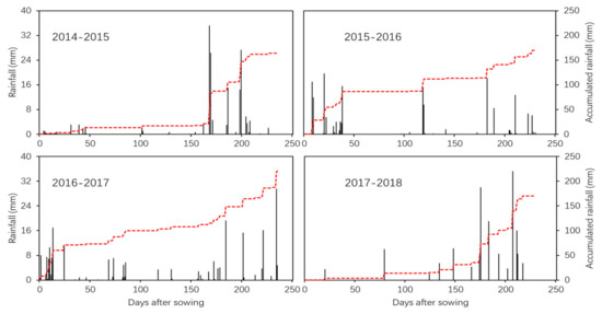 The temperature decreases gradually during the growing season reaching the minimum during wintering period, whereas it rises gradually reaching peak in the first week of June. Average value of Tmax and Tmin over the winter wheat season from 2014 to 2018 ranged from 4.85 to 16.38 °C and 5.60 to 6.51 °C, respectively (Table 1). Total value of ET0 in the winter wheat growing seasons during 2014–2018 was 648, 601, 627, and 623 mm, respectively; the corresponding daily evapotranspiration values were 2.8, 2.6, 2.7, and 2.7 mm d−1. The accumulated rainfall in the four seasons is shown in Figure 1. The precipitation values during the four consecutive seasons of 2014–2018 of the winter wheat were 164, 171, 222, and 170 mm, respectively, which were greater than the historic average of 161 mm (1951–2014); especially, there was 61 mm increase during the winter wheat growing season in 2016–2017.