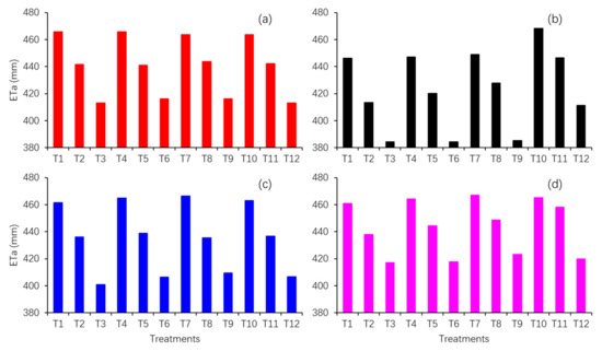 Actual evapotranspiration (ETa) of winter wheat in the seasons: (a) 2014–2015, (b) 2015–2016, (c) 2016–2017, and (d) 2017–2018. T1, T2, and T3 were If, I0.8f, and I0.6f, respectively (N120); T4, T5, and T6 were If, I0.8f, and I0.6f, respectively (N160); T7, T8, and T9 were If, I0.8f, and I0.6f, respectively (N200); and T10, T11, and T12 were If, I0.8f, and I0.6f, respectively (N240).
