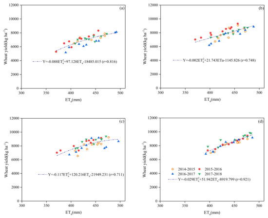 The relationship between yield and ETa has been shown to be linear [15,16,17,18] and quadratic [19,20,21]. As shown in Figure 3, the relationships between ETa and grain yield for winter wheat under different fertilization rates in the four growing seasons was found to be quadratic. In a study conducted in the NCP, to determine the relationship between winter wheat grain yield and growing seasonal evapotranspiration under different irrigation treatments, Zhang et al. (2011) also found quadratic relationship.