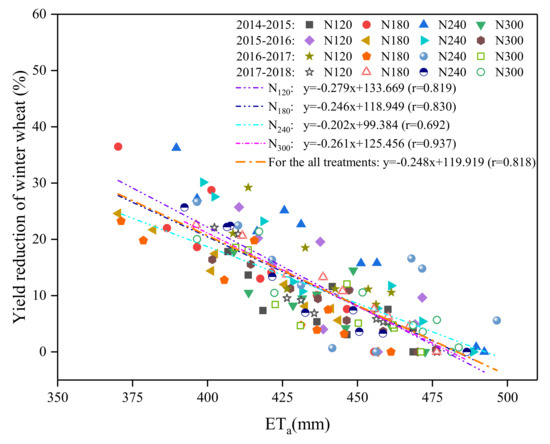 Relationships between ETa and wheat yield reduction in the different treatments over the four consecutive wheat seasons from 2014 to 2018.