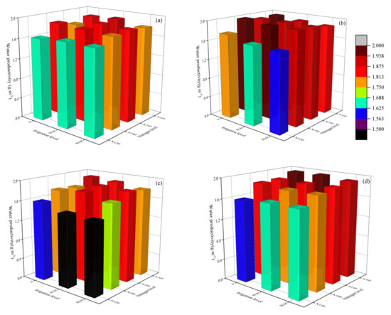 Water productivity of winter wheat in the season of (a) 2014–2015, (b) 2015–2016, (c) 2016–2017, and (d) 2017–2018.
