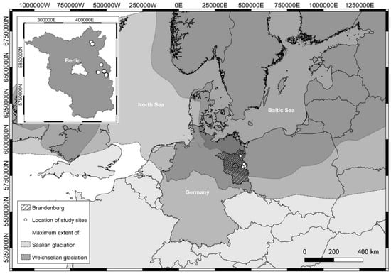 Map of Central Europe with the location of the study sites in the federal state of Brandenburg (Germany) that was largely influenced by the Saalian and Weichselian glaciation at the end of the Pleistocene (Projection: UTM ETRS89 33N) (after [,,]). The inlay map indicates the detailed location of the study sites.