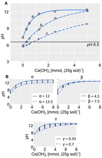 where α, β and γ are the regression coefficients of the exponential function. The exponential model is commonly used in soil science in the description of the kinetics of chemical reactions including titration and buffer curves [,]. In the range of Ca(OH)2 applied, the pH response did indicate the presence of not more than one buffering system which could have necessitated the fitting of a more complex model (for titration curves which show the buffering of exchangeable H+ and Al3+ the reader is referred to Sparks []). Depending on the differences in the soil acidity and the pH buffer capacity (pHBC), the titration curves of our samples varied as illustrated in Figure 2A. The coefficients of the model can be understood as follows: whereas α represents the threshold value to which the pH can maximally increase Figure 2B), the term α − β is the starting point of the graph at the axis of ordinates. β, on the other hand, is described by the difference from the starting point to the end point of the titration curve. Finally, γ represents the sensitivity of the buffer system. When γ is close to 0, the curve exhibits a strong concavity with a steep ascent (Figure 2A, curve a). When γ is close to 1, the ascent is gentle and the curve is almost linear (Figure 2A, curve c; Figure 2B). The parameter γ particularly characterizes the pHBC of the soils. This can be seen in Table 2, where the standard deviation of the pH response increases from pH0 to pH1.25. Correspondingly, in Figure 2 one can observe the differences in the concavity and the exponential part of the curves characterizing the strongest pH increase in the course of the curve due to the different pHBCs of the investigated soils. In the subsequent saturation phase of the curve (pH2.5 and pH5), when the pH change decreases, the standard deviation decreases (Table 2). Summery statistics of the BNC model parameters α, β and γ can be found in. Furthermore, it is of interest whether the parameters vary independently from each other or whether they contain redundant information about the pH buffering. In Table 3 Spearman’s Rho is shown as an indicator of the correlations between the model parameters. Correlations between α and γ as well as β and γ are weak, indicating that these parameters are largely independent. The correlation of parameters α and β is much stronger. This can be explained by the fact that α and β form an interaction term in the model (Equation (3)). Visually, one can observe this interaction in Figure 2B, which shows that both parameters affect the starting point of the curve at the y axis and thus, they cannot be completely independent from each other.