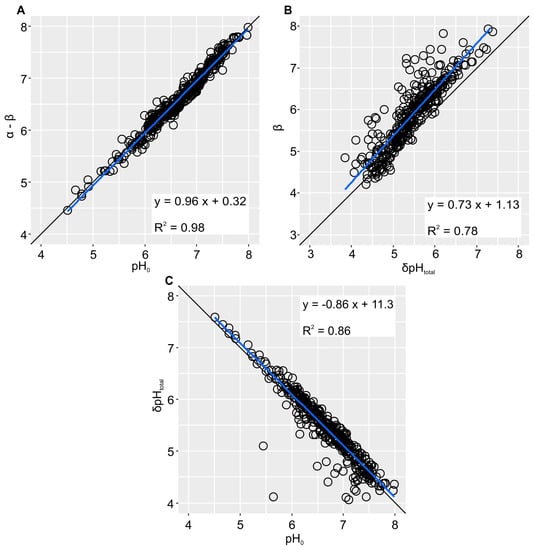 Correlations between (A) the BNC regression coefficients α − β and pH0, (B) β and the total pH increase over all five base additions (δpHtotal), and (C) pH0 and δpHtotal.