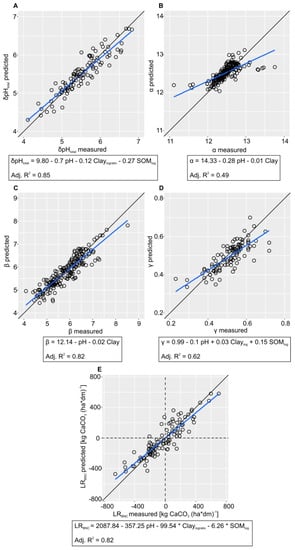 Best-performing multi-variate linear regression (MLR) models in order to predict the BNC parameters (A) δpHtotal, (B) α, (C) β, (D) γ and (E) LRBNC (Claylogratio—log-ratio-transformed clay content, SOMlog—log-transformed SOM content).