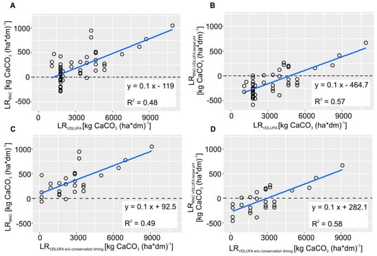 (A) Comparison between the LRVDLUFA and the LRBNC for a fixed target pH of 6.5, (B) the LRVDLUFA and LRBNC calculated for variable target pH values according to the VDLUFA, (C) the LRVDLUFA without conservation liming and LRBNC for a fixed target pH of 6.5, and (D) the LRVDLUFA without conservation liming and LRBNC calculated for variable target pH values according to the VDLUFA.