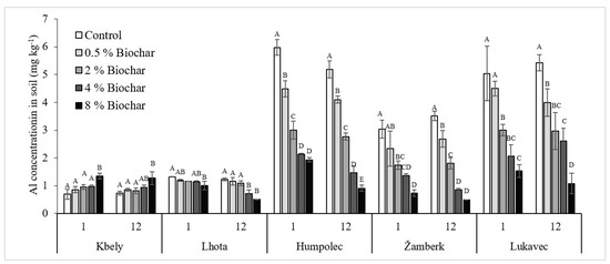Effect of biochar addition on soil-available content of Al (mg kg−1). On the horizontal axis, 1 and 12 stand for 1st and 12th week of incubation period or sample collection time, respectively. Different capital case letters represent significance difference (p < 0.05) of treatments within same sample collection time of same soil.