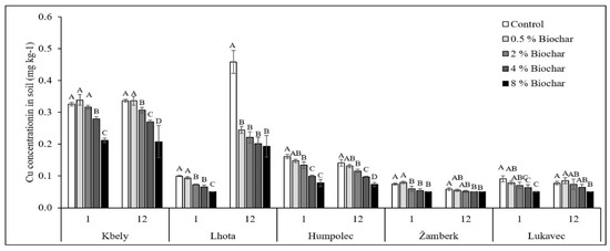 Effect of biochar addition on soil-available content of Cu (mg kg−1). On the horizontal axis, 1 and 12 stand for 1st and 12th week of incubation period or sample collection time, respectively. Different capital case letters represent significance difference (p < 0.05) of treatments within same sample collection time of same soil.