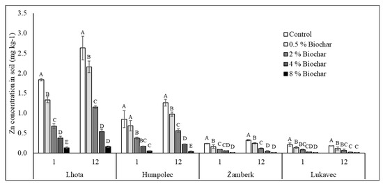 Effect of biochar addition on soil-available content of Zn (mg kg−1). On the horizontal axis, 1 and 12 stand for 1st and 12th week of incubation period or sample collection time, respectively. Kbely soil is not presented due to the available content of Zn is below detection limit of ICP used for the measurement (below 0.02 mg kg−1). Different capital case letters represent significance difference (p < 0.05) of treatments within same sample collection time of same soil.