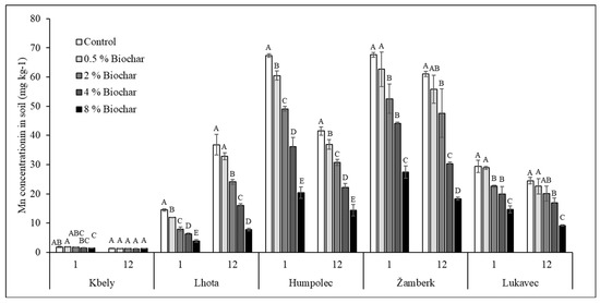 Effect of biochar addition on soil-available content of Mn (mg kg−1). On the horizontal axis, 1 and 12 stand for 1st and 12th week of incubation period or sample collection time, respectively. Different capital case letters represent significance difference (p < 0.05) of treatments within same sample collection time of same soil.