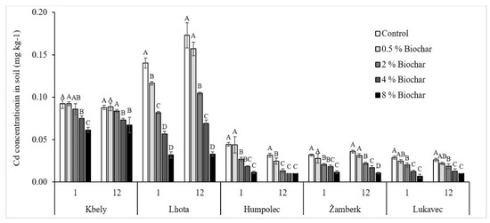 Effect of biochar addition on soil-available content of Cd (mg kg−1). On the horizontal axis, 1 and 12 stand for 1st and 12th week of incubation period or sample collection time, respectively. Different capital case letters represent significance difference (p < 0.05) of treatments within same sample collection time of same soil.