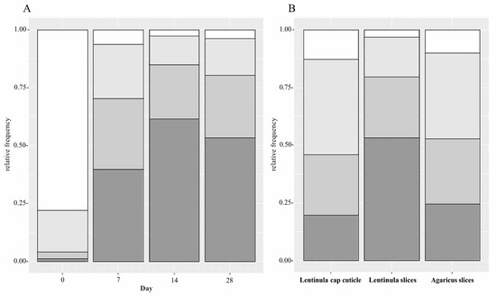 The ability of the strains isolated on days 7 to 28 to deteriorate L. edodes caps was significantly higher than that of the strains isolated on day 0 (z-ratio = −5.7, −8.7 and −7.7, with p-value < 0.001 in all cases) (Figure 3A). The slices of L. edodes were significantly more damaged than its cap cuticle (z-ratio = −3.6, p-value < 0.001) (Figure 3B). This clearly indicates that the cuticle serves as a barrier against microbial deterioration [14]. The isolated bacterial strains produced a higher damage level on shiitake slices than on A. bisporus slices (z-ratio = 2.9, p-value = 0.011) (Figure 3B). This could be due to differences in the enzymatic repertoire of the various bacterial strains or to bacterial strains having higher deterioration ability on the mushroom species from which they are isolated [5,8,14]. Regarding the latter hypothesis, it would be interesting to test whether bacterial strains develop pathogenic mechanisms specific to the mushroom in which they grow.