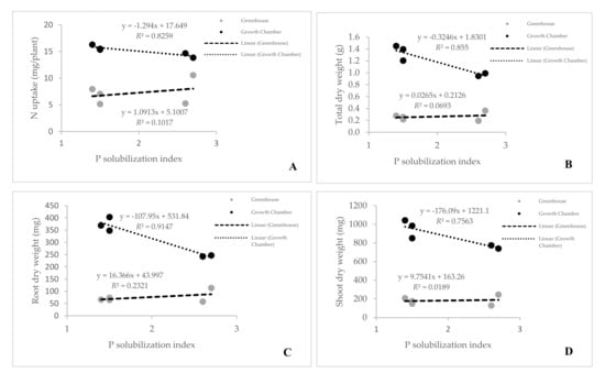 Regressions between bacterial inorganic phosphate solubilization index and N uptake (A), total plant dry weight (B), root dry weight (C), and shoot dry weight (D) of upland rice under greenhouse and growth chamber conditions. Data under growth chamber were collected 30 DAI, and 60 DAI under greenhouse conditions.