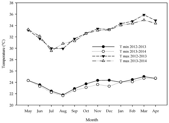 Dynamics of minimum and maximum temperatures over the cropping period (2012–2014) at Kpong, Ghana. The 1st and 3rd cropping cycles were from July to November while the 2nd and 4th cropping cycles spanned the period December to April.