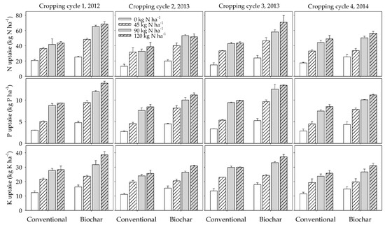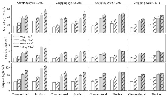 Effect of biochar (10 t·ha−1) and nitrogen fertilizer (kg·ha−1) on the nutrient uptake in rice grain under irrigated conditions over 4 cropping cycles, at Kpong, Ghana. Error bars are standard deviations of the means. The 1st and 3rd cropping cycles were from July to November while the 2nd and 4th cropping cycles spanned the period December to April.