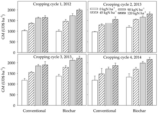 Gross margins (GM) of biochar (10 t·ha−1) and nitrogen fertilizer (kg·ha−1) used in irrigated rice over 4 cropping cycles (2012–2014) at Kpong, Ghana. Error bars are standard deviations of the means. The 1st and 3rd cropping cycles were from July to November while the 2nd and 4th cropping cycles spanned the period December to April.