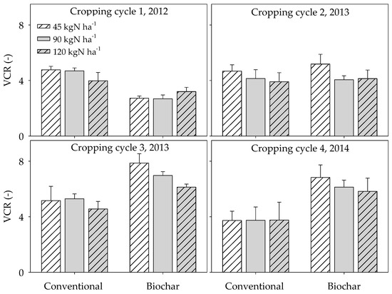 Unlike GM and GR, VCR generally decreased with increasing N application (Figure 6). The value cost ratio (VCR) was influenced by the interaction among cropping cycle × biochar × nitrogen fertilizer as per the mixed-model repeated measures. At the level of cropping cycle, biochar × nitrogen interaction influenced VCR in the 1st cropping cycle.