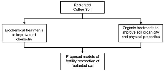 There have been several methods applied to supplement the nutrient loss for replanted coffee plantations. Applying organic matter, including green manure and organic fertilizer has been proved to positively impact on soil organic matter. Organic fertilizer meets part of the crop’s nutritional needs and creates favorable environment for soil microorganisms to develop. It provides growth stimulants for plants to grow and resist unfavorable conditions []. It also helps maintain the soil biological balance, as well as preventing the growth of harmful microorganisms in the soil through destruction, antagonistic and inhibiting mechanisms []. Intercropping is also an agricultural practice, which improves the organic matter in the soil. In this technique, two or several crops are planted in the same field simultaneously with the main crop to generate a wide variety of yields per land surface []. Many kinds of plant and tree have been studied and applied to intercrop with coffee such as palm trees, macadamia, banana [,,]. Individual measures have the effect of improving one or several aspects of soil properties. It is necessary to develop an optimal combination of methods to improve the overall properties of the soil.