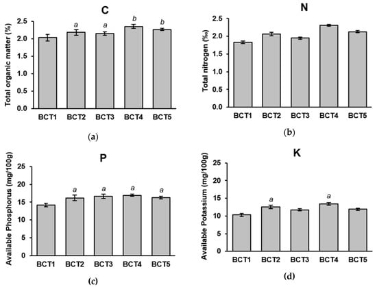 The contents of total organic matter (a), total nitrogen (b), available phosphorus (c) and available potassium (d) in the soil at the 4th cultivating year by biochemical treatments. BCT, biochemical treatment. Bars show means ± SD. Bars with the same letters are not statistically different based on the least significant difference at p < 0.05.
