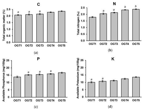 The contents of total organic matter (a), total nitrogen (b), available phosphorus (c) and available potassium (d) in the soil at the 4th cultivating year by organic treatments. OGT, organic treatment. Bars show means ± SD. Bars with the same letters are not statistically different based on the least significant difference at p < 0.05.