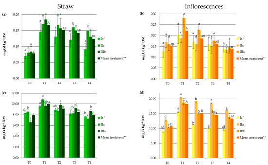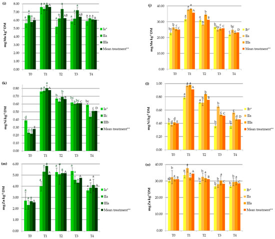 Impact of soil amendments on contents of heavy metals in hemp straw: (a) Cd, (c) Cr, (e) Cu, (g) Fe, (i) Mn, (k) Ni, (m) Zn, and inflorescences (b) Cd, (d) Cr, (f) Cu, (h) Fe, (j) Mn, (l) Ni, (n) Zn. T0: the control without fertilization, T1: 170 kg N ha−1 from sewage sludge, T2: 170 kg N ha−1 from sewage sludge and 100 kg ha−1 of phosphogypsum, T3: 170 kg N ha−1 from sewage sludge and 500 kg ha−1 of phosphogypsum, T4: 170 kg N ha−1 from sewage sludge and 1000 kg ha−1 of phosphogypsum, I: cv. Białobrzeskie, II: cv. Tygra, III: cv. Beniko. * means of varieties regardless of treatments; ** means of treatments regardless of cultivars. Bars with the same letter are not significantly different (capital letters indicate differences among the means of treatments regardless of cultivars).
