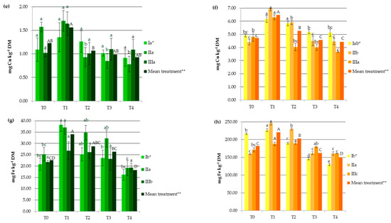 Impact of soil amendments on the contents of available heavy metals in the soil: (a) Cd, (b) Cr, (c) Cu, (d) Fe, (e) Mn, (f) Ni, (g) Zn. T0: the control without fertilization, T1: 170 kg N ha−1 from sewage sludge, T2: 170 kg N ha−1 from sewage sludge and 100 kg ha−1 of phosphogypsum, T3: 170 kg N ha−1 from sewage sludge and 500 kg ha−1 of phosphogypsum, T4: 170 kg N ha−1 from sewage sludge and 1000 kg ha−1 of phosphogypsum, I: cv. Białobrzeskie, II: cv. Tygra, III: cv. Beniko. * means of varieties regardless of treatments; ** means of treatments regardless of cultivars. Bars with the same letter are not significantly different (capital letters indicate differences among the means of treatments regardless of cultivars).