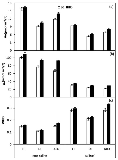 Leaf photosynthesis (An) (a), stomatal conductance (gs) (b), and intrinsic water use efficiency (WUEi) (c), of quinoa leaves as affected by biochar, irrigation regimes, and salinity. B0 and B5 indicate biochar levels, respectively. FI, DI, and ARD indicate full irrigation, deficit irrigation, and alternate root-zone drying irrigation, respectively. Error bars indicate ±SE (n = 4). SE indicates standard error.