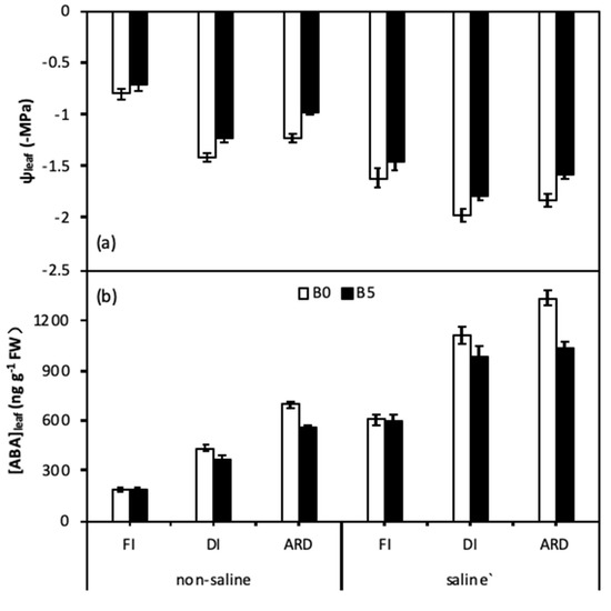 Total leaf water potential (Ψleaf) (a) and abscisic acid (ABA) concentrations (b) of quinoa leaves as affected by biochar, irrigation regimes, and salinity. B0 and B5 indicate biochar levels, respectively. FI, DI, and ARD indicate full irrigation, deficit irrigation, and alternate root-zone drying irrigation, respectively. Error bars indicate ±SE (n = 4). SE indicates standard error.