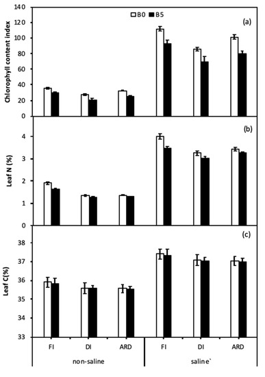 Chlorophyll content index (CCI) was significantly affected by B, I, S, B × S, and S × I (Figure 3a, Table 3). Across I treatments under saline conditions, CCI was 20.0%, 22.1%, and 26.5% higher in B0 compared with B5, respectively. Leaf N content was significantly affected by B, I, S, B × I, and B × S (Figure 3b, Table 3). Regardless of S and I, leaf N in B5 was significantly lower than in B0. Leaf C content was solely affected by salinity (Figure 3c, Table 3). Regardless of B and S, CCI and leaf N in ARD were both higher than in DI.