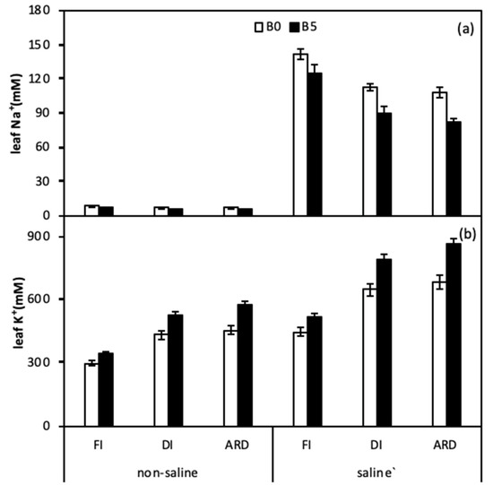 Leaf Na+ (a) and Leaf K+ (b) as affected by biochar, irrigation regimes, and salinity. B0 and B5 indicate biochar levels, respectively. FI, DI, and ARD indicate full irrigation, deficit irrigation, and alternate root-zone drying irrigation, respectively. Error bars indicate ±SE (n = 4). SE indicates standard error.