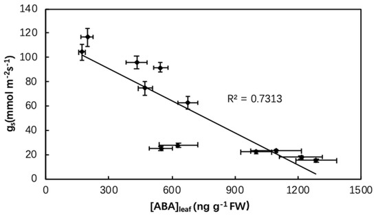 Relationship between stomatal conductance (gs) and abscisic acid (ABA) concentrations of quinoa leaves as affected by biochar, irrigation regimes, and salinity.