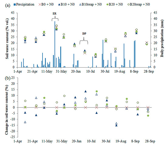 Soil water content dynamics in unfertilized treatments during the studied period in 2019: (a) soil water content with indication of daily precipitation, ER—extreme rainfall, DP—dry period; (b) percentage change in soil water content relative to control treatment B0 + N0 (without biochar and N-fertilizer application).