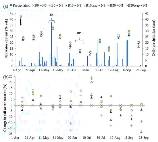 Soil water content dynamics in fertilized treatments N1 during the studied period in 2019: (a) soil water content with indication of daily precipitation, N—nitrogen fertilizer application, ER—extreme rainfall, DP—dry period; (b) percentage change in soil water content relative to control treatment B0 + N0 (without biochar and N-fertilizer application).