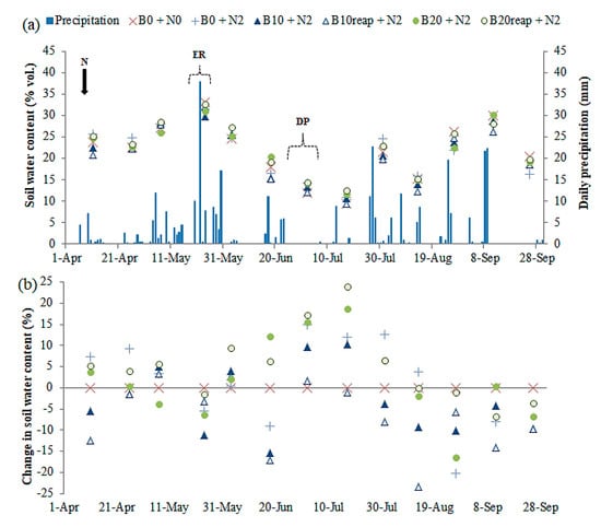Soil water content dynamics in fertilized treatments N2 during the studied period in 2019: (a) soil water content with indication of daily precipitation, N—nitrogen fertilizer application, ER—extreme rainfall, DP—dry period; (b) percentage change in soil water content relative to control treatment B0 + N0 (without biochar and N-fertilizer application).