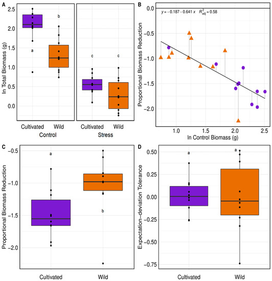 Stress tolerance has often been assessed as relative performance under stressed and non-stressed conditions, where a lower reduction in absolute, percentage or proportional performance indicates higher tolerance [7,8,15,16]. However, this alone neglects differences in plant vigor (defined here as performance under non-stressed conditions), which is generally greater for crop cultivars than their wild progenitors and may influence how plants respond to stress [2,4,17]. Several stress tolerance indices exist that weight the stress-induced reduction in growth by vigor in some manner, in order to identify lines that do relatively well in both environments [18,19,20]. However, these indices do not explicitly assess plant vigor as a trait that could influence tolerance. To do so, we developed a tolerance metric that accounts for vigor. Accessions are scored on their deviation from the expected response to stress, or expectation-deviation tolerance, so that traits associated with vigor may be separated from traits associated with tolerance [21]. When comparing stress tolerance of crops and wild relatives, it is useful to take into account any trade-off between vigor and stress tolerance, so that the genetic basis of traits responses independent of those associated with vigor can be identified and incorporated into breeding programs.