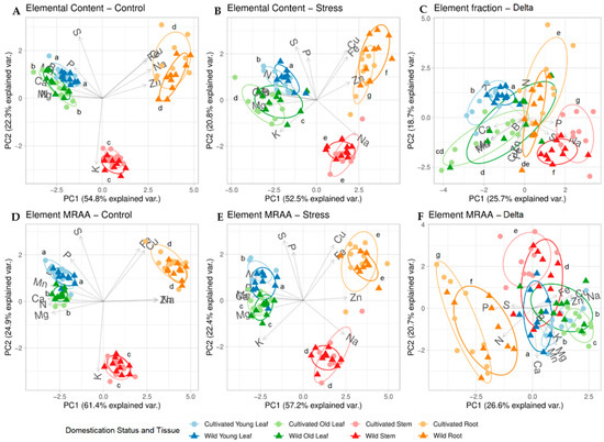 Principal component analyses (PCA) of elemental concentration (A–C) and the mass relative allocated amount (MRAA) of elements (D–F) in the four tissue types (young leaf, old leaf, stem, and root) for wild and cultivated H. annuus. Panels represent control treatment (A,D), stress treatment (B,E), and Delta, the difference between treatments (C,F). Different lower-case letters denote significant Hottelings-T2 test for differences (p < 0.05) among the eight tissue type and domestication status groups.