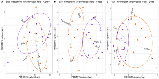Principal component analyses (PCA) of the six size-independent morphological traits, which include specific leaf area (SLA) and leaf succulence per area and the four tissue type mass fractions (Young Leaf Mass Fraction (YLMF), Old Leaf Mass Fraction (OLMF), Stem Mass Fraction (SMF), and Root Mass Fraction (RMF)) under (A) Control conditions, (B) Stress conditions, and (C) Delta (the change between treatments). Purple circles indicate cultivated accessions and orange triangles indicate wild accessions. Different lower-case letters denote significant Hottelings-T2 test for differences (p < 0.05) between the two domestication status groups.