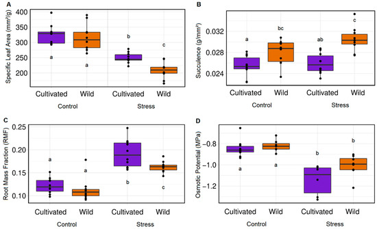 Estimated marginal means of wild and cultivated accessions under the control and stress treatments (grouped by domestication status) for (A) Specific leaf area (SLA), (B) Leaf succulence on a per area basis of a most recently fully expanded leaf (MRFEL)), (C) Root mass fraction (RMF) (calculated by root mass/total biomass) and (D) Osmotic potential taken from a rehydrated MRFEL. Different lower-case letters denote significant differences (p < 0.05) based on post-hoc contrasts from Tukey-HSD tests.