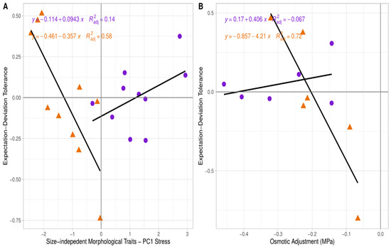 The relationships between expectation-deviation tolerance metric and (A) size-independent morphological traits PC1 under stress, or (B) osmotic adjustment (OA). Purple circles indicate cultivated accessions and orange triangles indicate wild accessions.