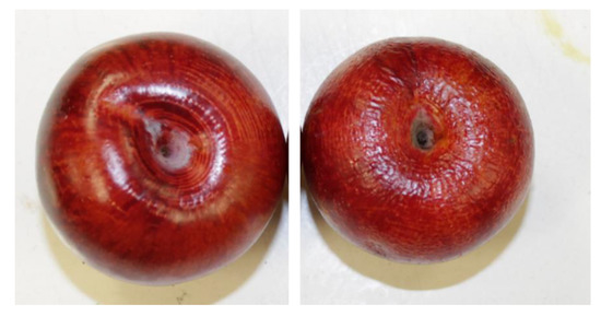 The quantity of shriveled fruit was visually inspected. Shrivel was counted when the shriveled skin extended over the shoulder of the fruit (Figure 1). Three cartons were used for each treatment, and shrivel incidence was per box (n = 3) and calculated as a percentage of shriveled fruit based on the initial fruit [20].