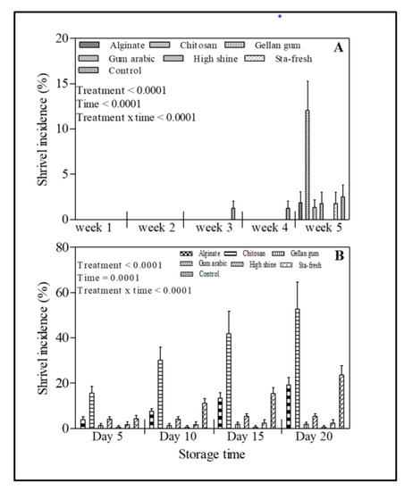 A significant interaction (p < 0.0001) was observed between treatment and storage time for both cold storage and shelf life conditions. At the end of cold storage, shrivel incidence in control plums was 2.52% (Figure 2A). In coated plums, shrivel incidence was lower (≤1.86%) than control plums at the end of cold storage, except for plums coated with chitosan (12.05%) that developed shrivel symptoms at 5 weeks cold storage (Figure 2A). At 5 d shelf life, shrivel incidence was lower in all coated plums (ranging from 0.60% to 4.17%) compared to the control (4.31%), except for plums coated with chitosan, which had 15.55% shrivel incidence (Figure 2B). Control fruit had 11% and 16% shrivel incidence at 10 and 15 d shelf life, respectively. At the end of the 20 d shelf life, control fruit had higher shrivel incidence (23.62%) in comparison to plums coated with gellan gum (1.93%), gum arabic (5.36%), Sta-fresh (2.38%) and High shine (0.60%) (Figure 2B). Shriveling in fruit has been linked to moisture loss, resulting from a loss of turgor in the underlying epidermal cells [5,30]. In our study, a strong positive relationship (R2 = 0.653) was observed between weight loss and shrivel occurrence in ‘African Delight™’ plums. Therefore, the effect of gellan gum, gum arabic, High shine and Sta-fresh on shrivel development can be linked to the moisture barrier properties of the coatings. On the contrary, chitosan promoted shrivel in the investigated plum cultivar. At 20 d shelf life, shrivel incidence of 52.19% was recorded. The observed adverse effect of chitosan on shrivel incidence may be attributed to the inability of chitosan to control moisture loss [31]. Similar results were observed in ‘Alberta’ peaches coated with chitosan and stored for 60 d at 4 °C and 80 ± 2% RH [32]. Although not clear, chitosan may have also modified the biomechanics of the fruit cuticle thereby magnifying the appearance of shrivel.