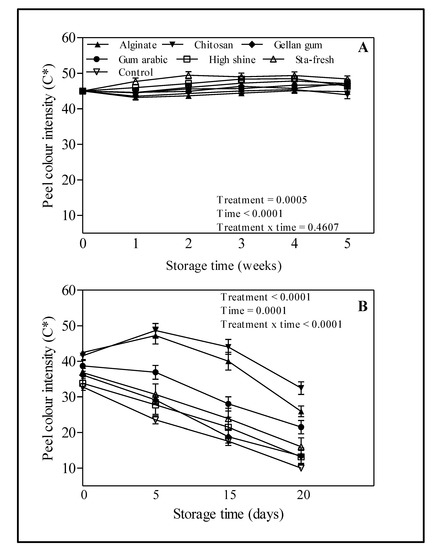 Color is another important factor in the perception of fruit quality. Figure 3 illustrates that the change in plum peel color was significantly (p < 0.05) influenced by the treatment and storage time for the cold storage period. The peel color intensity (C*) changed from 44.99 at harvest to between 43.93 (chitosan; p > 0.05) and 48.39 (alginate; p < 0.05) by the end of the cold storage period, although visually, the fruit remained bright red regardless of treatment (not shown). Although the interaction between treatment and storage time was significant (p < 0.0001) at shelf life period, peel color C* value decreased gradually as plums turned from bright red to dull red with time at shelf life period. Fruit coated with alginate and chitosan were an exception (Figure 3B), as the color change (from bright red to dull red) was less pronounced throughout the storage period, suggesting delayed ripening and suppressed anthocyanin synthesis [28].