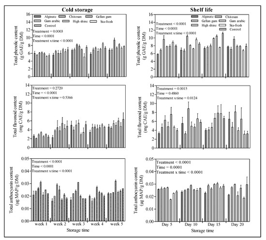 Total phenolic content (g GAE/g), total flavonoid content (mg CAE/g) and total anthocyanin content (µg MAP/g) in plums (‘African Delight™’) during a simulated shipping period (cold storage; −0.5 ± 2 °C and 90 ± 5% RH for 5 weeks) and shelf life (20 ± 2 °C and 75 ± 5% RH for 20 d). Means ± standard errors presented. In other to determine the interaction effects, factorial ANOVA was performed for main factors; treatment and storage time separately for cold storage and shelf life periods for each attribute.