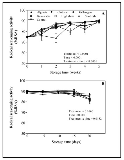 The antioxidant capacity (AOC) of plums is determined mainly by the content of polyphenols, ascorbic acid and carotenoids within the fruit. It may fluctuate during postharvest storage, depending on both biotic and abiotic factors [44]. In this study, the radical scavenging activity (RSA) increased significantly (p < 0.05) in all treatments from harvest (74.70%) throughout cold storage, and a significant (p < 0.0001) interaction was established between treatment and storage time (Figure 5A). High radical scavenging activities were maintained regardless of treatment and time during the shelf life period (Figure 5B). The high RSA ranged between 82% and 91%, with no significant (p = 0.1660) differences amongst the coatings. According to Matthes and Schmitz-Eiberger [45], polyphenols are the primary source of antioxidants in fruit. This is in support of the strong and positive relationship (r = 0.759) established between total phenolic content and DPPH.