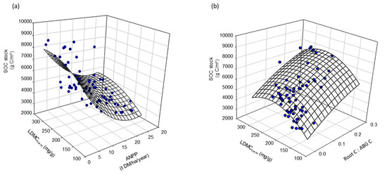 Relations among SOC stock and LDMCcwm and (a) ANPP (r2 = 0.60, p < 0.001) or (b) Root C:ABG C (r2 = 0.58, p < 0.001), for the seven fields assessed with multiple nonlinear regression.