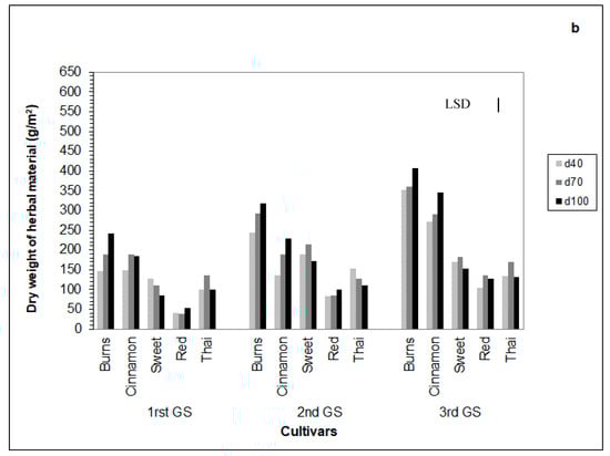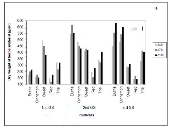The dry herb yield was relatively high and varied from 37 g/m2 to 495 g/m2 and most cultivars having yields greater than the dry herb yield reported in other studies [11,14,15]. The dry herb yield variation that was found reflects different genetic backgrounds of the cultivars that were used in this study and similar response was found by others using a number of different genotypes [11,16,45,49]. Most of the cultivars had yield greater than 100 g/m2 which is considered very high. These data suggest that most of the cultivars that were used can provide high dry herb yield under Mediterranean conditions and can be adapted by the farmers.