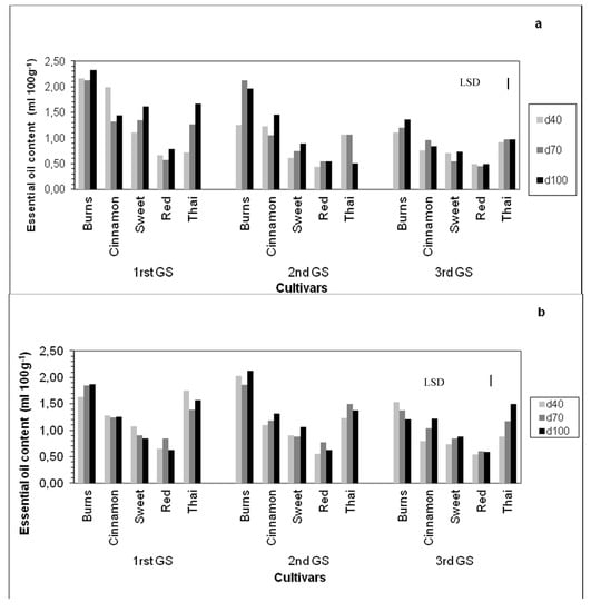 Essential oil content is a characteristic that can be affected by genotype, growing conditions, growth stage etc. [11,16,45,55]. In the present study essential oil content was affected by the irrigation level. Water stress can positive or negative effect of on essential oil content as it was reported in other species [16,17,56,57]. It was found a great variation in the essential oil content among the cultivars that were used as it ranged from 0.45 up to 2.33 mL 100 g−1 and depended from the growth stage, cultivar, year and irrigation level. Most of the cultivars had essential oil content higher than the oil content reported in other studies 0.6 to 1.7 mL 100 g−1 dry herbage [11,16,45,46]. Differences in basil essential oil content between the present and other studies could be due to differential environmental conditions and genetic material that were used. It was reported that basil essential oil content can vary depending on growth conditions [7,45]. The findings from this study are important in two ways: (1) basil can be used for high essential oil production and (2) most of the cultivars can be used for high dry herb yield.